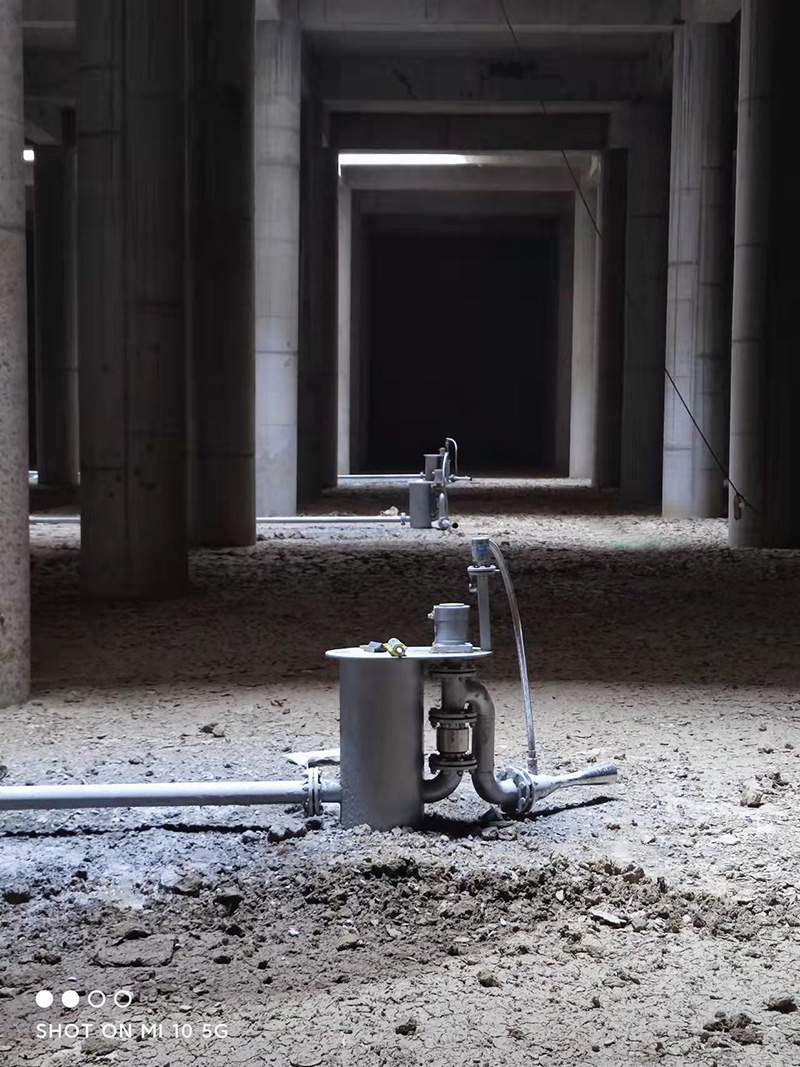 当蓄水池内的水快要排尽时,雨水调蓄池智能喷射器利用调蓄池集水坑的水对调蓄池的底部进行强力冲洗,冲洗后的污水经过调蓄池集水坑中的潜污泵排出调蓄池外。