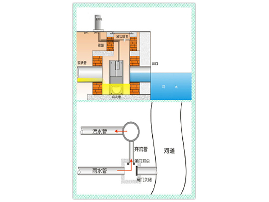 晴天时,截污闸门处于开启状态,雨水闸门处于关闭状态,管道内的部分污水通过截污口自流向污水管道,或通过污水提升装置提升到污水管道,做到晴天时污水零直排。